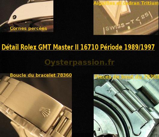 En 1989, Rolex lance la GMT MASTER II 16710, elle est équipée du calibre 3185 avec changement de date semi rapide, d’un verre saphir avec cyclope, elle est étanche à 100 m, est équipée d’une couronne Twinlock. Deux références de bracelet sont disponible, le 78360 et le 62510 (jubilé), ses cornes sont percées. Les aiguilles et le cadran sont au tritium.